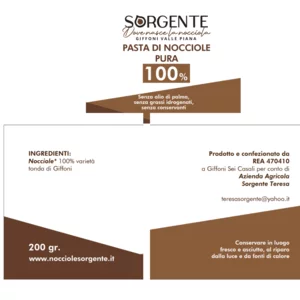 Aus Giffoni Valle Piana kreiert der Bauernhof La Sorgente einen einfachen Aufstrich, dessen einzige Zutat für sich spricht: Haselnusspaste aus 100 % Tonda di Giffoni-Haselnüssen .